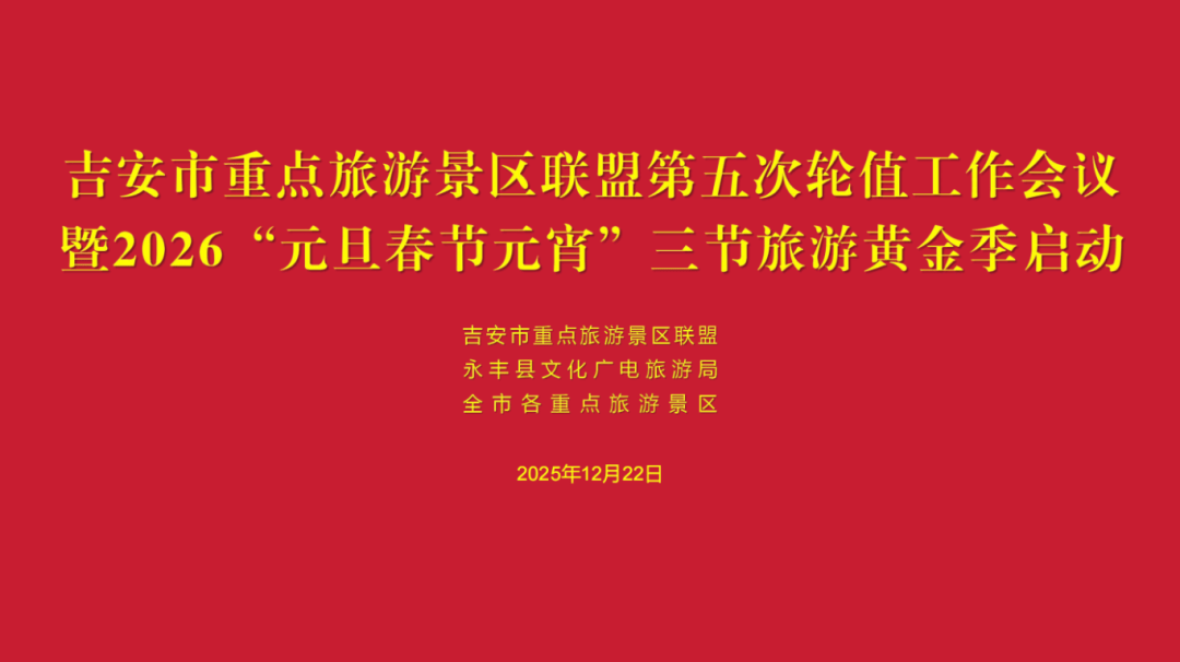 吉安市重点旅游景区联盟第五次轮值工作会议12月22日在永丰恩江古城景区召开,同时启动了2026元旦春节元宵“三节”旅游黄金季活动。会议是在市文化广电旅游局的指导下,由市重点旅游景区联盟主持,永丰县文化广电旅游局协办召开的。联盟名誉主席曾传文总结了第四任轮值工作会议以来,联盟秘书处联合第四任轮值主席单位——吉州区文化广电旅游局和钓源古村·十里芳菲景区,以及全市各重点旅游景区开展的卓有成效的工作,特别是在搭建“资源共享、景区互动、客源互送”平台创新举措方面的经验做法,并布置了下一阶段联盟的工作打算。