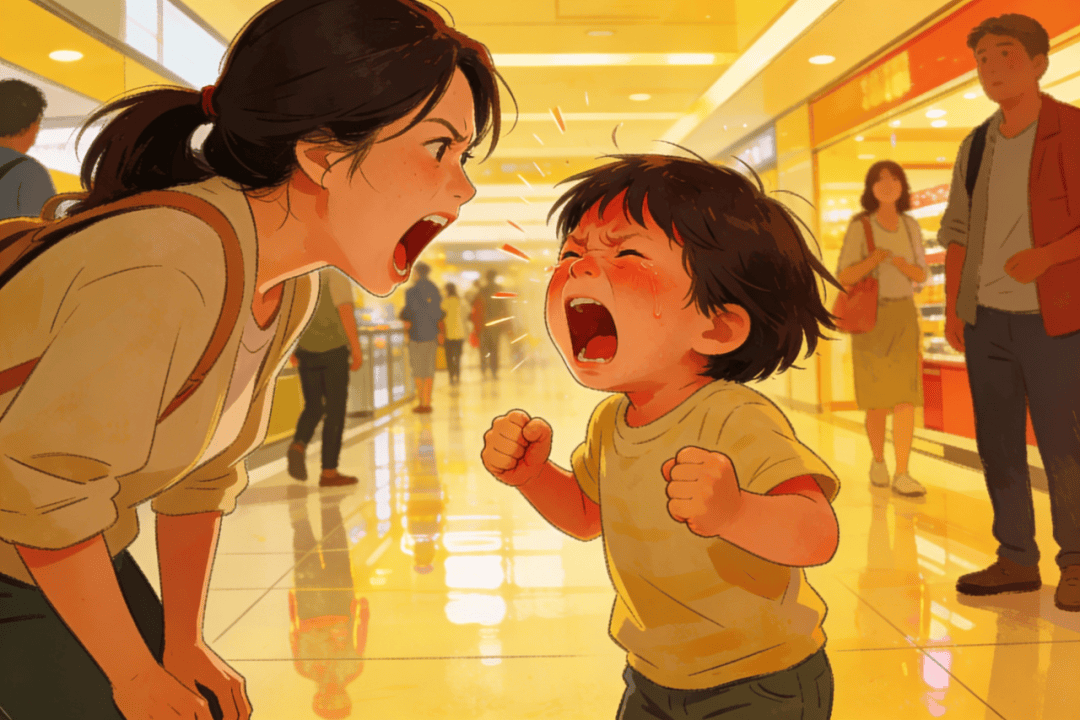 商场里,一位年轻的妈妈满脸通红地对着哭闹的孩子吼叫。