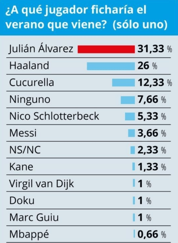 西班牙媒体《世界体育报》对巴萨明年夏窗的引援目标进行了一项调查问卷,投票者是300名巴萨会员,每人仅限1票,结果清晰的展现出了球迷们的心仪目标。
