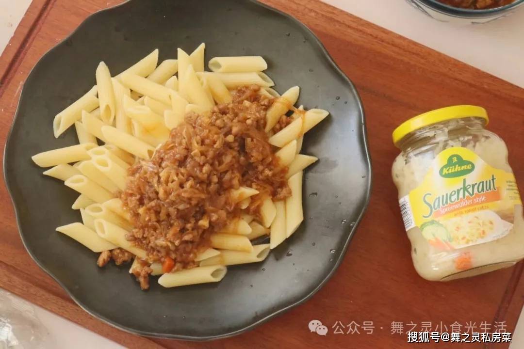 最后浇上自己做好的酱香浓郁又美味的酸菜肉酱,拌一下开吃,哇塞,这也太香了吧,一口气吃光一大盘,儿子说以后这个万能酱就是我们家保留的酱了,必须经常做。