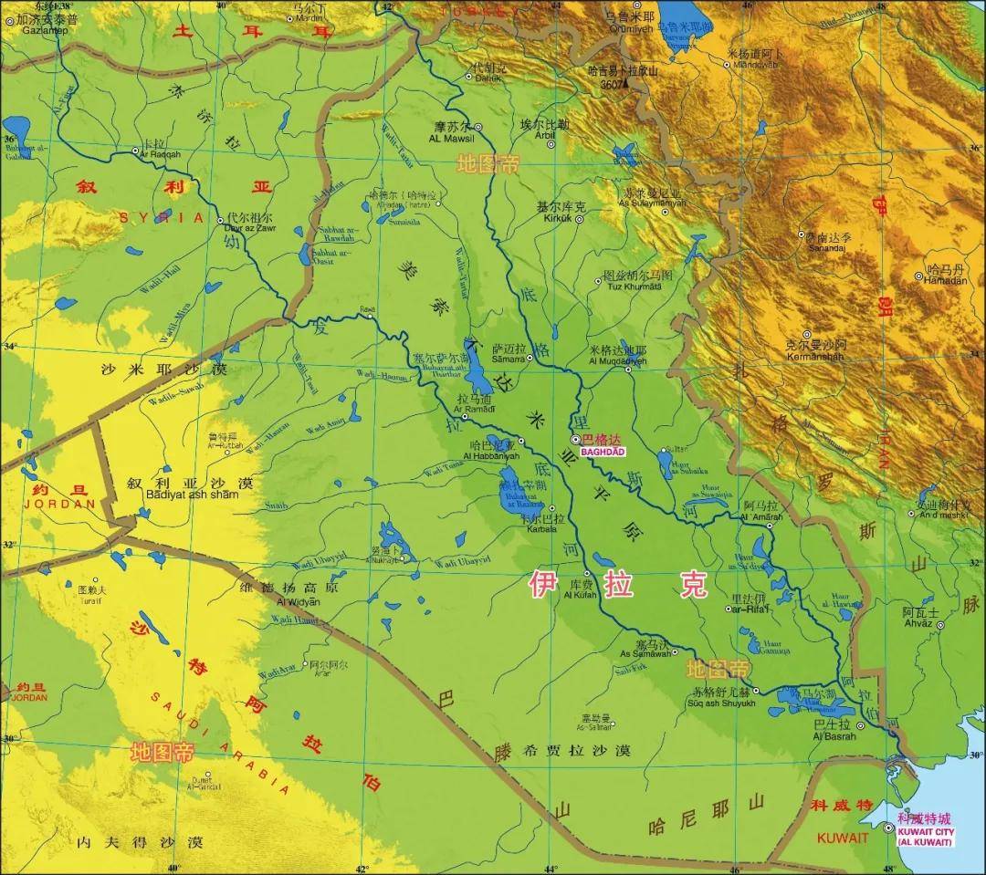 伊拉克位于阿拉伯半岛东北部,幼发拉底河和底格里斯河自西北向东南流贯全境,面积约43.83万平方千米,放在我国省级行政区中居第八位。