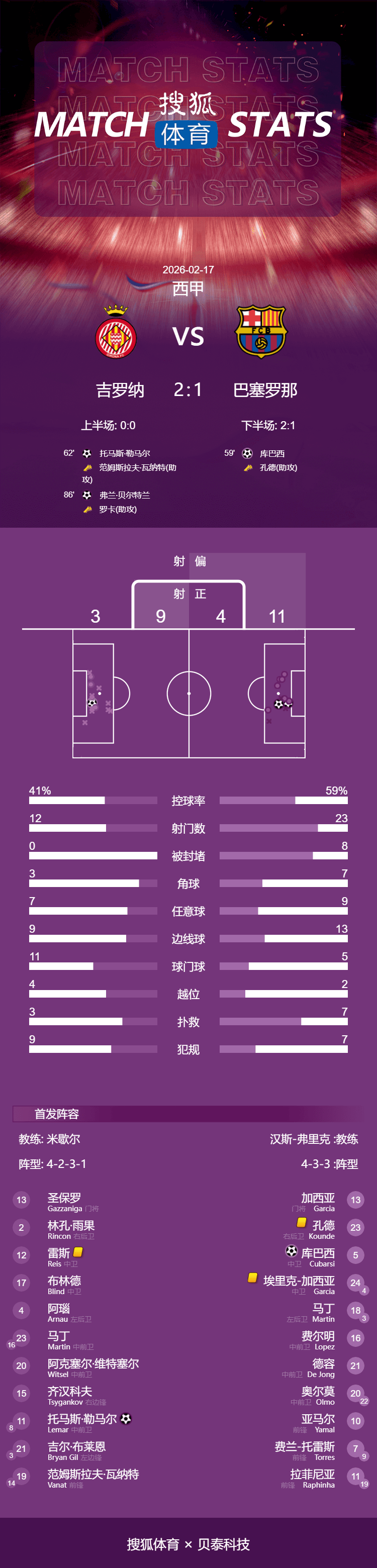 北京时间2月17日凌晨4:00,西甲联赛第24轮,巴塞罗那在客场对阵赫罗纳。上半场比赛,拉菲尼亚中柱,亚马尔补时阶段罚丢点球,半场双方0-0战平;下半场,库巴西帮助巴萨取得领先,勒马尔秒扳平,贝尔特兰第86分钟贡献绝杀,最终巴萨1-2不敌赫罗纳,本轮过后积分榜被皇马反超2分。