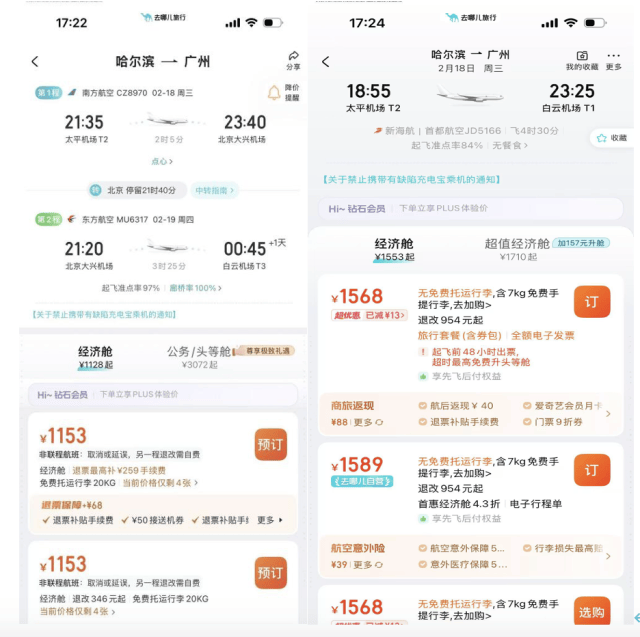 比如大年初二从哈尔滨到广州,在北京中转停留21小时的超长中转航班,机票价格比直飞便宜400元。在去哪儿平台上,这类转机时间超过12小时、票价比直飞更低的超长中转航班,预订量同比去年增长了三成。