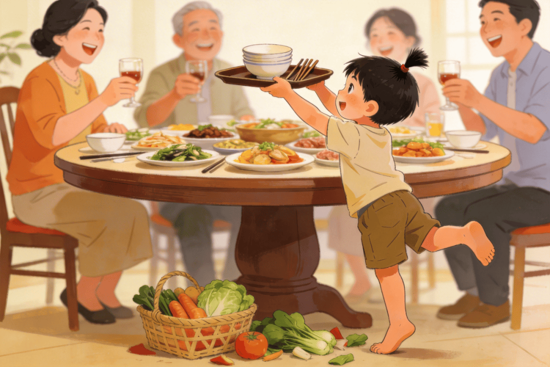 今年妈妈调整了让孩子单纯等待的方式,而是带着他一起做准备工作,给他布置了择菜、摆碗筷的任务,并且在等待开饭的过程中还设计了一个食物接龙游戏—大家根据要求,轮流说出食物的名字,获胜的人能获得奖励,比如绿色的食物、甜的食物等。