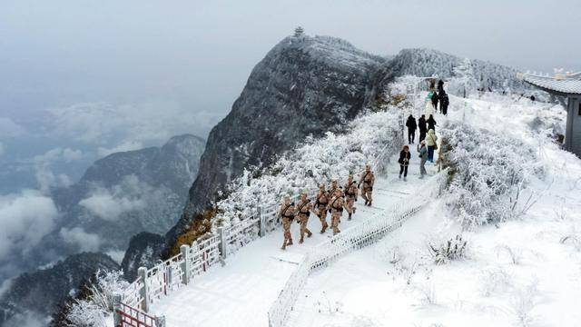 ↑武警乐山支队某中队官兵在峨眉山执勤。王浩宇 摄