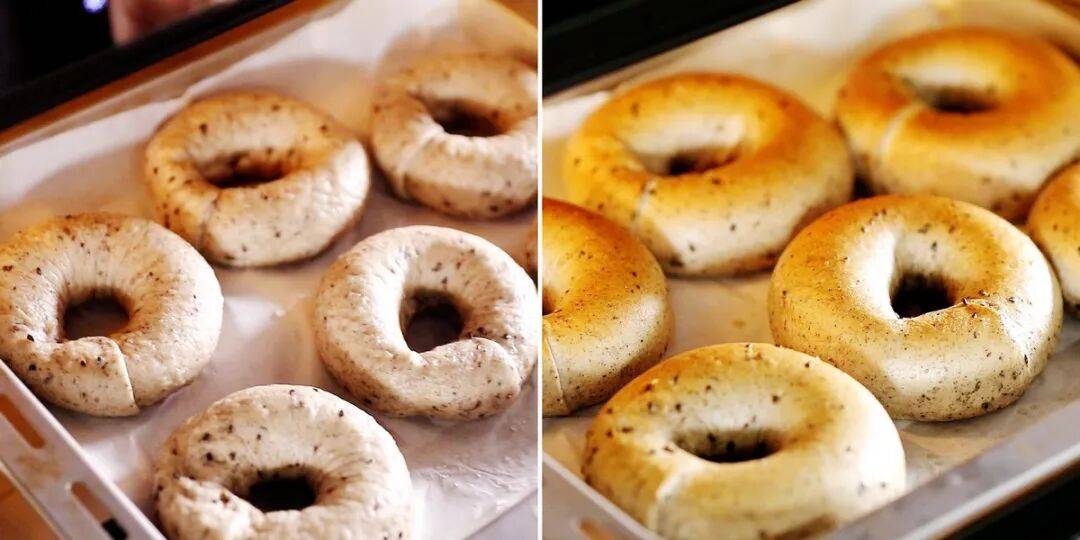 将煮好的贝果放入铺了硅油纸的烤盘里。这时候烤箱也差不多预热好了。放入预热好的烤箱,中层,上下火200℃,烘烤18-20分钟。根据烤箱实际情况调整烘烤温度和时间,将贝果表面烤至金黄色即可出炉。