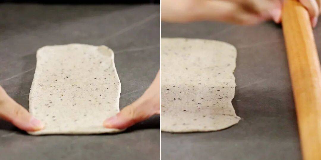 用擀面杖将一条长边擀得更薄一些,这样收口处会更服帖。