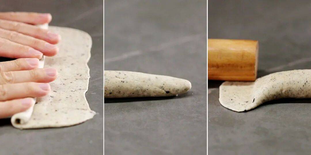 取一个松弛好的小面团,擀开成为长条形。然后用手指将两边拉直,成为长方形面团。