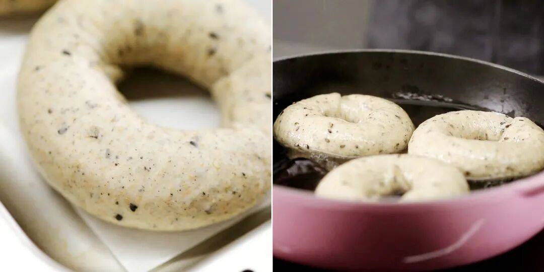煮面团,是 制作贝果的必要步骤,煮过之后的面团才会得到贝果那种独特的 充满嚼劲的口感。