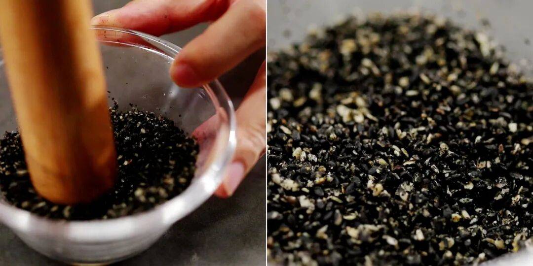 首先我们将熟的黑芝麻用擀面杖略微碾一碾,使它成为黑芝麻碎。黑芝麻不用碾磨得太细腻。