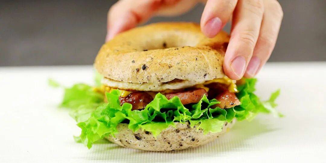 我更喜欢把它做成三明治,将贝果横切开,夹上蔬菜、香肠、煎蛋等食材,搭配你喜欢的酱汁(黄芥末酱、番茄酱、沙拉酱等等),就是一份美味的三明治了。
