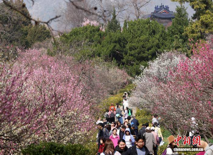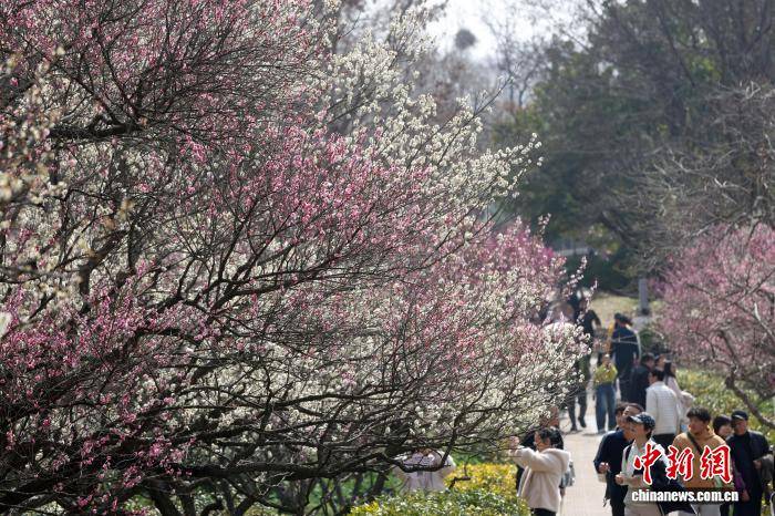 2月22日,江苏南京,市民和游客欣赏盛开的梅花。近日,随着天气转暖,素有“天下第一梅山”美誉的南京明孝陵梅花山上的梅花全面盛放,一步一景,花香满径,吸引了大批市民和游客前来徜徉花海,沐浴春光。中新社记者 泱波 摄