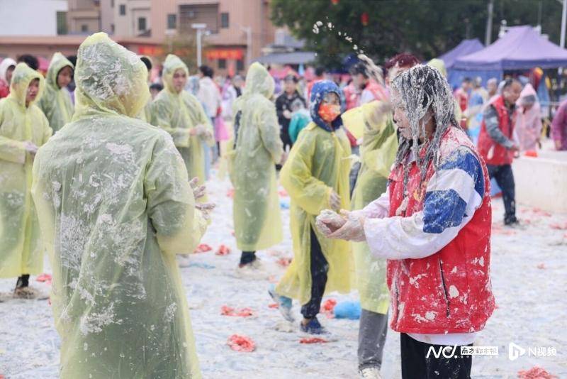 每年这天,社岗下村都沉浸在一片喜庆的锣鼓与欢笑中。由村中长老带队,狮队开路,村民们举行传统的上灯仪式,随后——万众期待的 “豆腐大仗” 便正式打响!洁白的“福气弹药”在空中横飞,欢声笑语响彻巷陌,场面震撼而热闹。