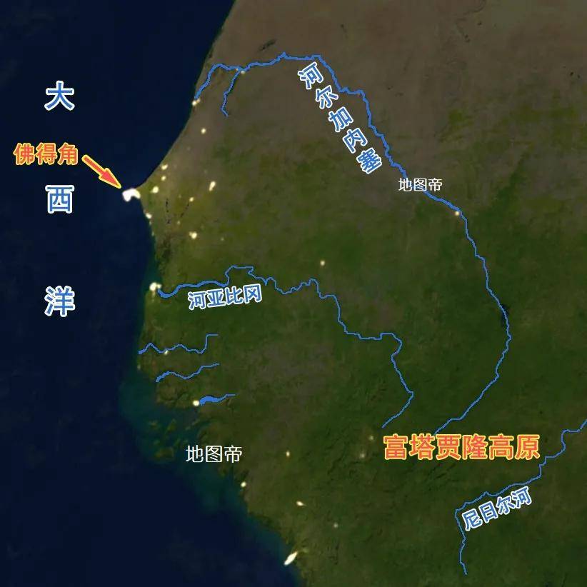 佛得角半岛,西濒大西洋,位于非洲大陆的最西端,坐标是北纬14°44′41″、西经17°31′13″。佛得角半岛像个鱼钩深入大海,属塞内加尔。