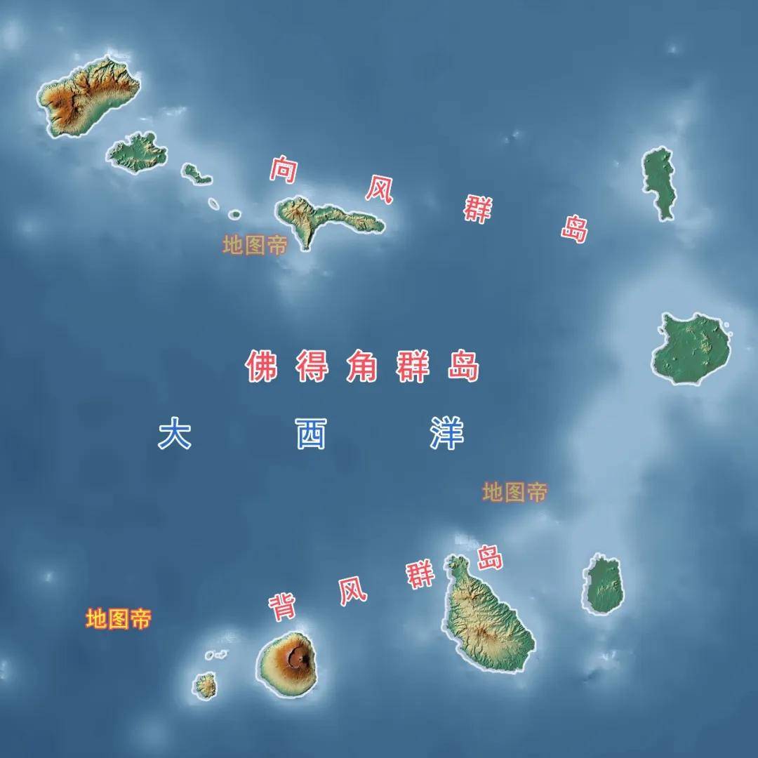 佛得角群岛位于非洲大陆西侧,分为南北两部分,北为向风群岛,南为背风群岛。