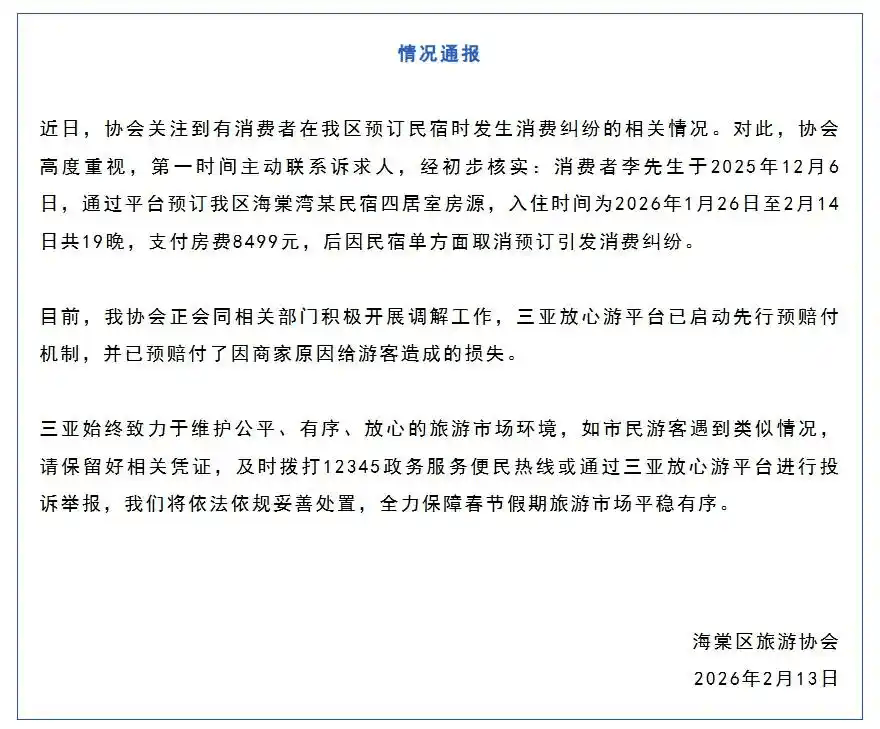 海南三亚海棠区旅游协会与三亚市民宿协会2月13日相继发布通报,针对游客预订民宿遭遇单方面取消预订的消费纠纷事件作出处置,涉事民宿已被下架产品、列入行业黑名单,游客的经济损失也已获得全额赔付。