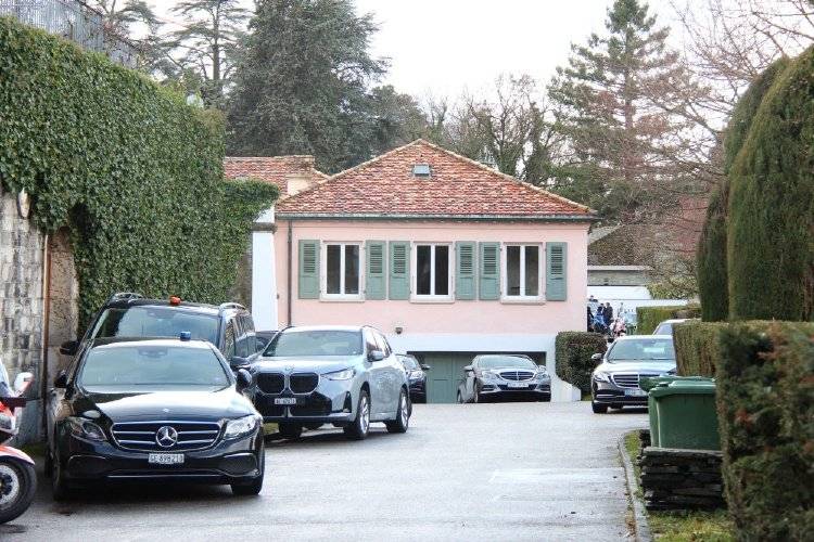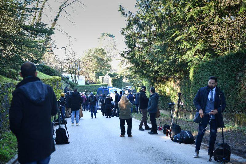 2月26日,记者在瑞士日内瓦阿曼驻日内瓦外交代表机构附近等待。谈判地点周边安保措施严密,多名安保人员在外围执勤。新华社记者 连漪 摄