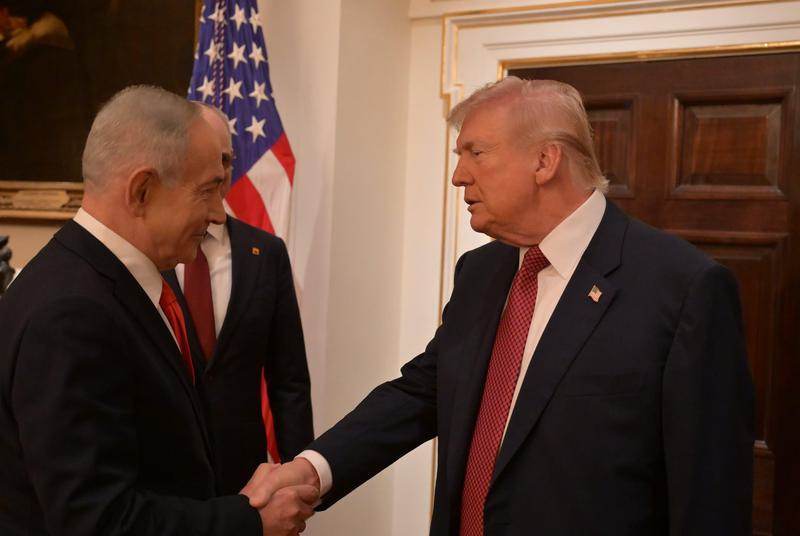 2月11日,在美国首都华盛顿白宫,美国总统特朗普(右)迎接到访的以色列总理内塔尼亚胡。新华社发(以色列政府新闻办公室供图)