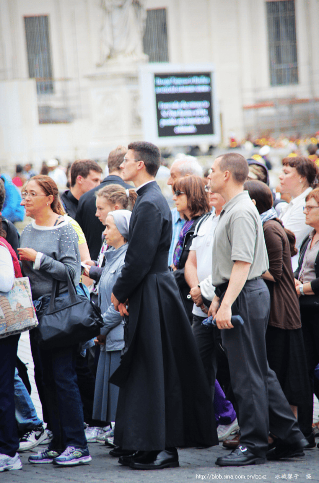 去梵蒂冈的那天上午天气一直阴沉,午后又下起了雨,耽误了不少时间。因为不让大巴停车,我们只能换乘公交前往。等赶到梵蒂冈城门时,眼前的长龙队伍让我们倒吸一口气,那架势堪比上海世博会,蜿蜒着拐了无数道弯。全是不同肤色、不同装扮的游客,在这个仅 0.44 平方公里、差不多只有北京故宫三分之二大的小国家里,几万人像蝼蚁一样缓缓蠕动。