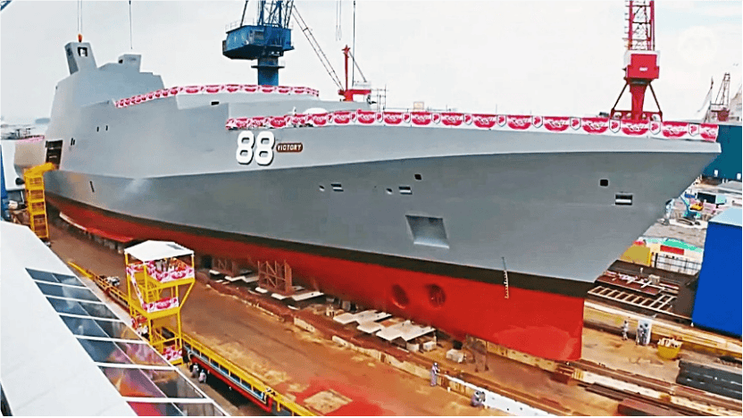 “战区”频道称,“胜利”号21日在新加坡新科工程公司所属的造船厂下水,由该国国防部长陈振声的夫人为其正式命名。不同寻常的是,这艘新舰不仅沿用了“胜利”级导弹护卫舰首舰“胜利”号的舰名,也沿用了相同的“88”舷号。