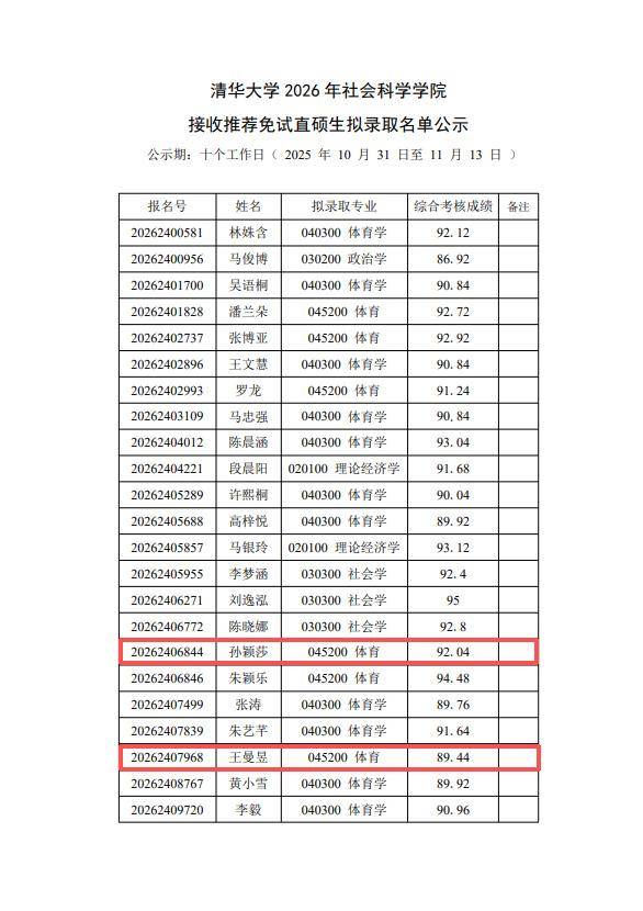 今年9月,清华大学社会科学学院发布《清华大学2026年社会科学学院接收优秀应届本科毕业生免试攻读研究生综合考核名单公示》,其中,孙颖莎、王曼昱在列。