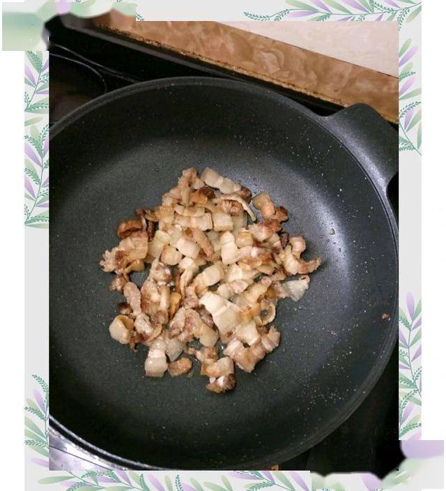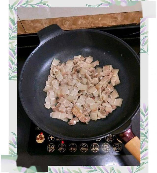 将锅烧至微热,接着放入五花肉,用小火慢慢煎烤。小火煎烤五花肉至微焦,并倒出多余猪油,这样可以让五花肉更加香嫩。