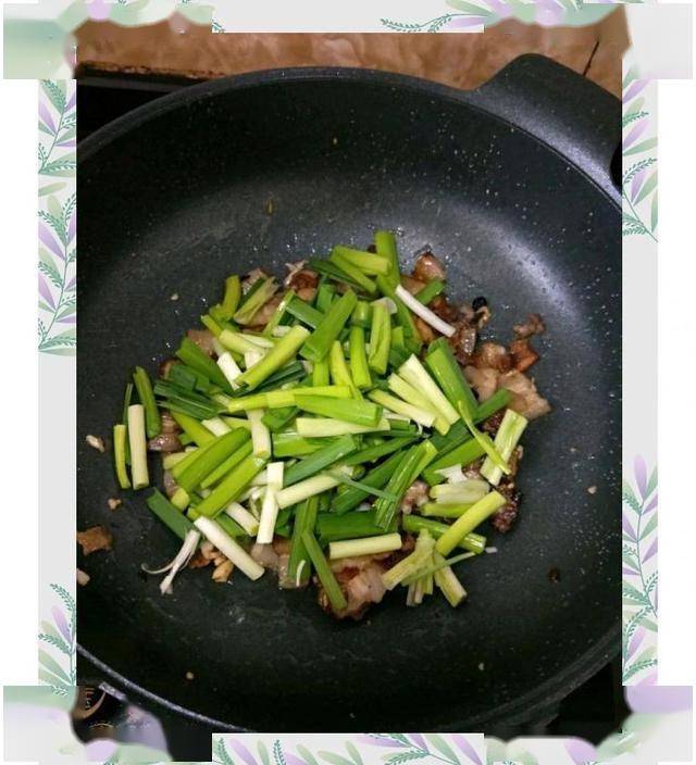 接下来,将蒜苗加入锅中。将蒜苗加入锅中翻炒至入味,使其吸收五花肉的香气。
