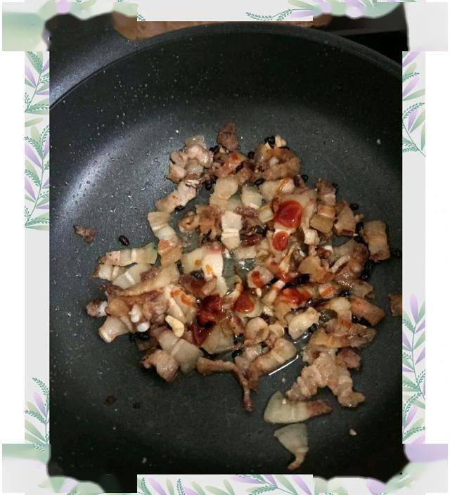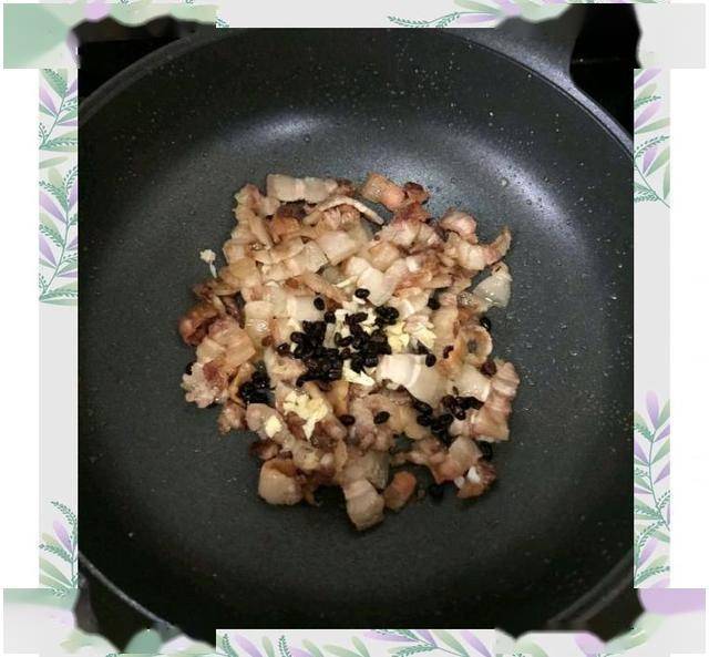 加入蒜蓉和豆豉,迅速翻炒片刻,使其与五花肉充分融合。加入蒜蓉和豆豉翻炒,再淋入耗油调味,以提升五花肉的风味。
