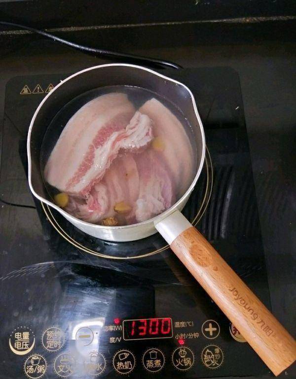 首先,将五花肉放入锅中,加入适量的料酒、姜片以及少许盐,然后烧开并煮五六分钟,将五花肉煮熟,去除血沫。