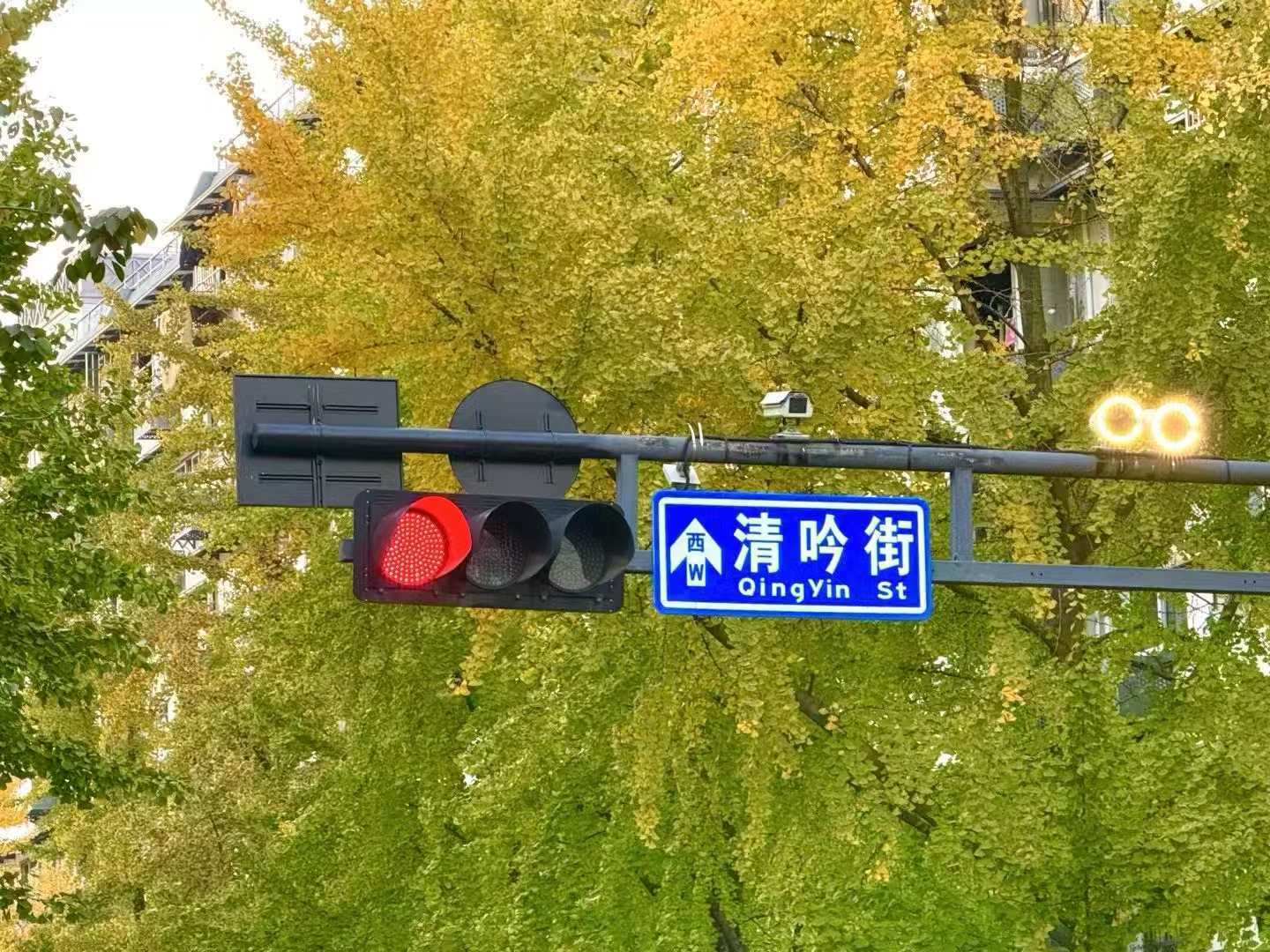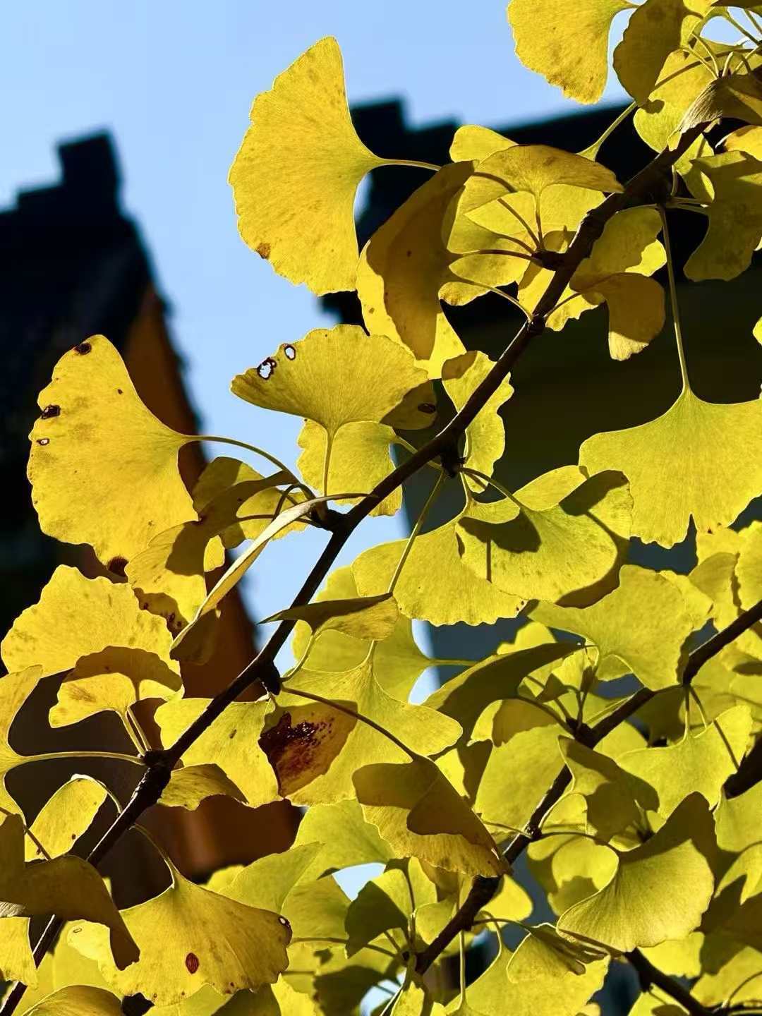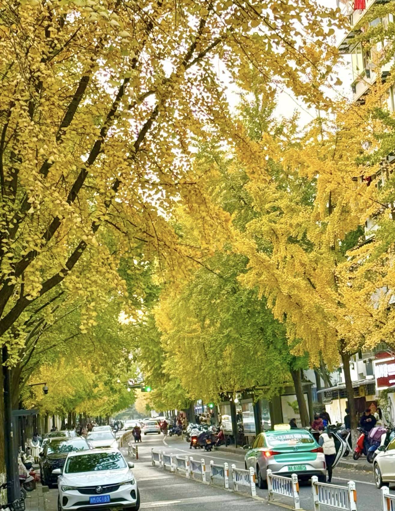 岁近龙年尾声,昼渐短,夜渐长。叶片仿佛能感知时光流转,自边缘开始,悄然染上淡绿与微黄,任由自然以最温柔的笔触点染。黄与绿交融出渐变的诗意,终凝成一片纯粹的金色。阳光穿过时,整棵树如挂满金币,又似燃起金色的火焰。远远望去,宛若大自然打翻了调色盘,将最绚烂的一抹金,慷慨赠予了这条街。