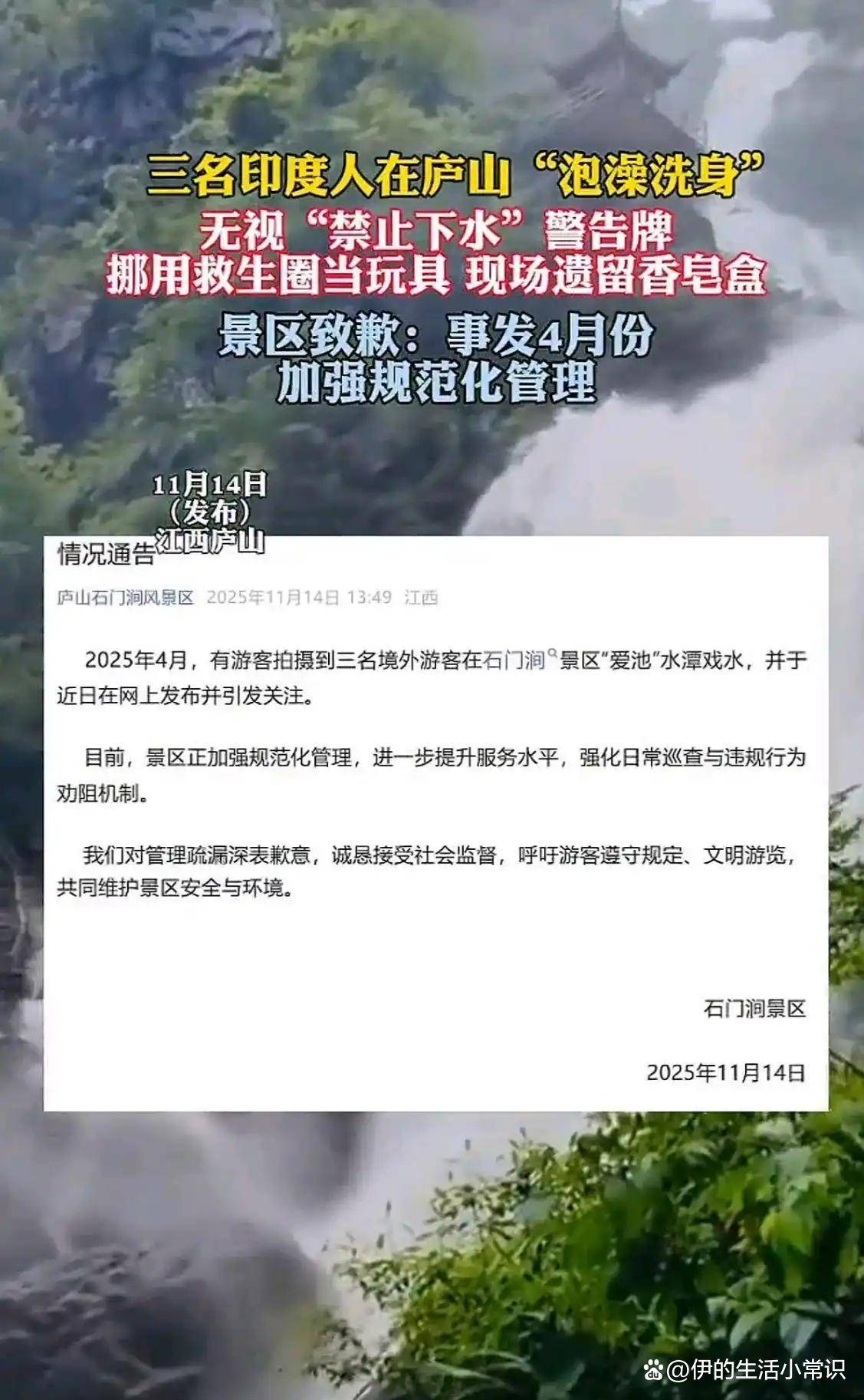 庐山“搓澡事件”发生在2025年4月,但直到11月初才在社交媒体上引发广泛关注。 视频显示,三名印度籍男子在庐山石门涧景区的“爱池”水潭中赤膊沐浴。 他们使用肥皂清洗身体,导致水面上漂浮着白色泡沫,并将岸边的救生圈当作玩具扔入水中嬉闹。