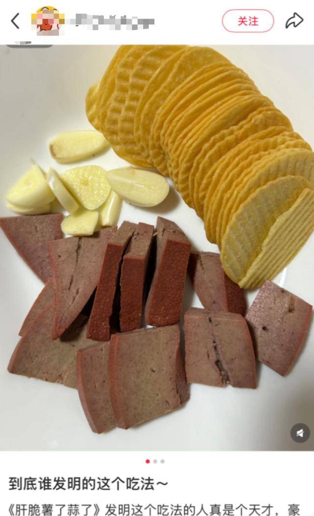 最近,一种被网友起名为“肝脆薯了蒜了”的零食组合爆火。在不少视频中,博主们将搭配好的卤制猪肝、酥脆薯片与辛辣生蒜片混合在一起食用,连连表示“上头”“绝配”。