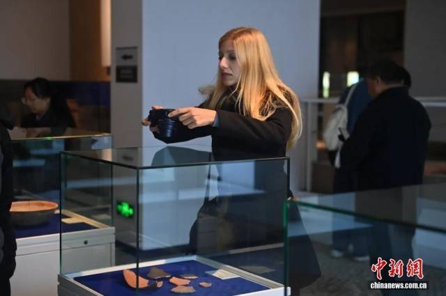 2024年10月22日,2024青年汉学家研修计划甘肃班团队22个国家的青年汉学家,走进甘肃省天水市秦安县大地湾遗址参观并进行专题研修。图为汉学家在拍摄大地湾博物馆藏品。 中新社记者 李亚龙 摄