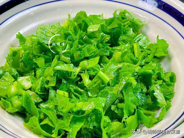 第三步:将萝卜叶冲洗干净,然后把萝卜叶切成小碎步,萝卜叶不用盐杀,杀了的萝卜叶反而不太好吃。大家买萝卜叶时,尽量买嫩一点,这种萝卜叶苦涩味比较轻。