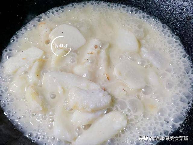 第五步:将适量水放入锅中,然后将芋头搅拌几下后,盖上锅盖,大火煮5分钟左右,直到锅中的汤汁变得乳白色,就代表芋头已经煮好了。