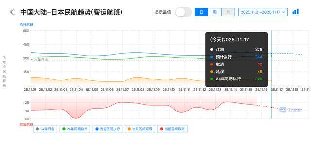 11月17日,记者通过飞常准App查询发现,当天中国大陆与日本之间的计划客运航班量为376架次,共取消了32架次。平台信息还显示,11月18日将取消该线路航班38架次。