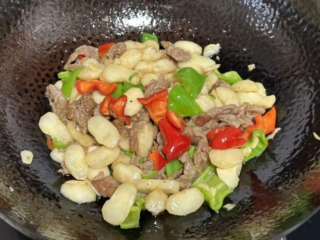 5、开盖后倒入之前炒好的牛肉,快速颠锅或翻炒,使荸荠的清脆与牛肉的鲜嫩充分融合,约30秒后即可关火装盘。