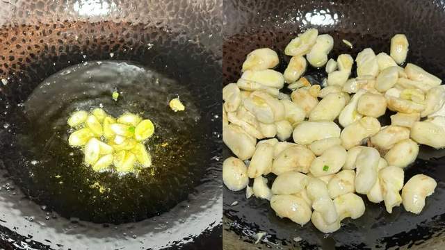3、另起锅少加点植物油,加入蒜片翻炒出香味;这个菜油不需要很多,一点点就够了;