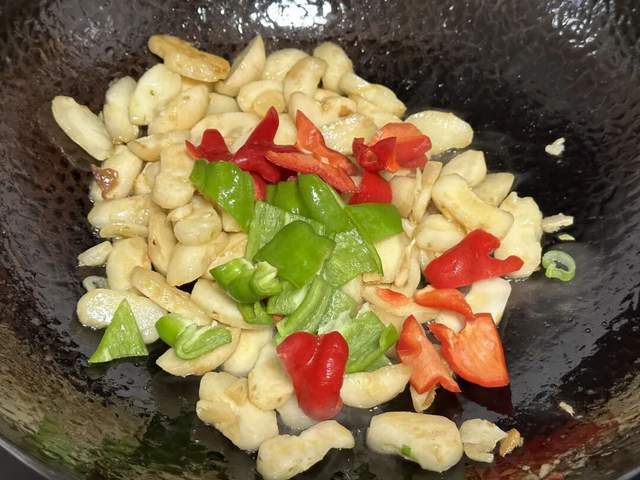 4、加入荸荠翻炒均匀,再加入海盐一勺、生抽一勺翻炒均匀,再把青红椒加进去,不要翻动,加一丢丢的清水,焖不上1分钟左右。这样青椒不会辣,但是会增加青椒的香味,孩子也可以吃。如果一点都不吃辣的可以不加;