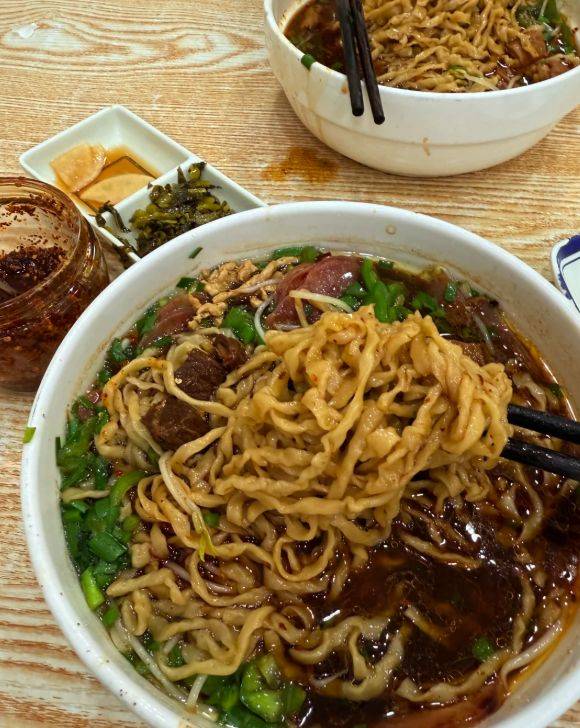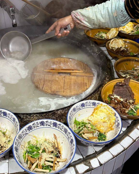 与烫干丝的温柔形成鲜明对比的,是镇江锅盖面的豪放不羁。其最大的奇观,便是煮面的大锅里,飘着一个小锅盖。据说这样能压住翻滚的面汤,使面条均匀受热,汤不溢出,煮出的面条格外筋道。