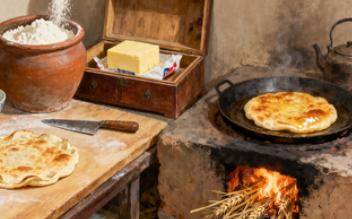 “把缸里的一点白面倒出来,又从柜子里取出一瓶奶奶没有动过的黄油,启开瓶盖,挖了一大块,抓了一把白糖,兑点起子,擀了两张黄油发面饼。抓了一把莜麦秸塞进灶火,烙熟了。黄油烙饼发出香味。”