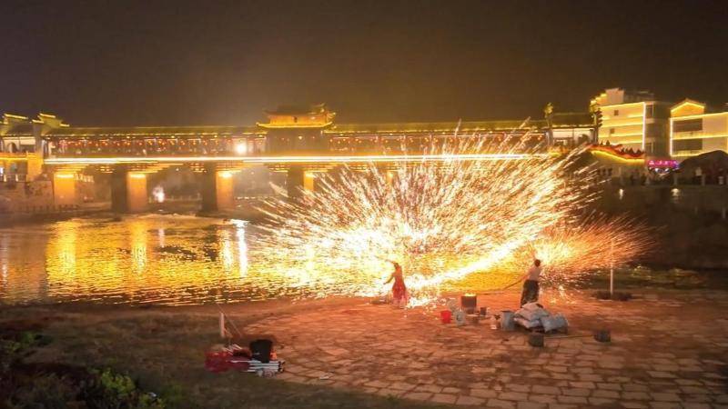 夜幕降临,华灯初上,黎川古城景区愈发热闹非凡。在横港桥的亲水平台,视觉盛宴“打铁花”在这里震撼上演。作为本次新春活动的重头戏,这项古老的民俗技艺在春节的夜空下焕发出全新的生命力。表演现场,民俗表演者将滚烫的铁水奋力抛向高空,随即用木板精准击打。刹那间,万千金红色的铁花如流星般迸溅四射,在夜空中交织缠绕、层层绽放。