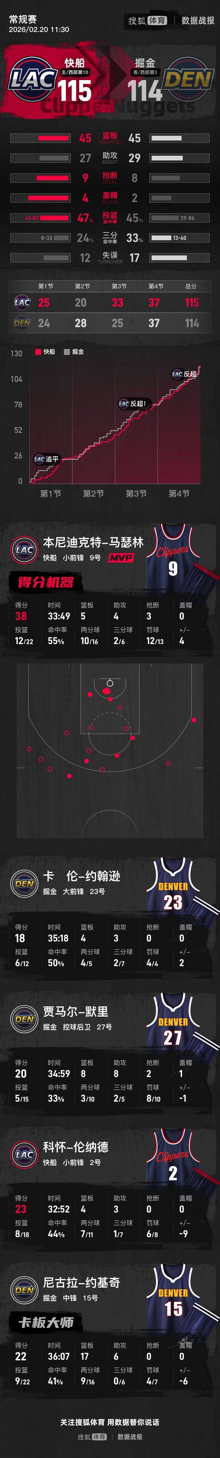【搜狐体育战报】北京时间2月20日NBA常规赛,主场作战的快船以115-114击败掘金。科林斯11分12篮板4助攻,约基奇22分17篮板6助攻。
