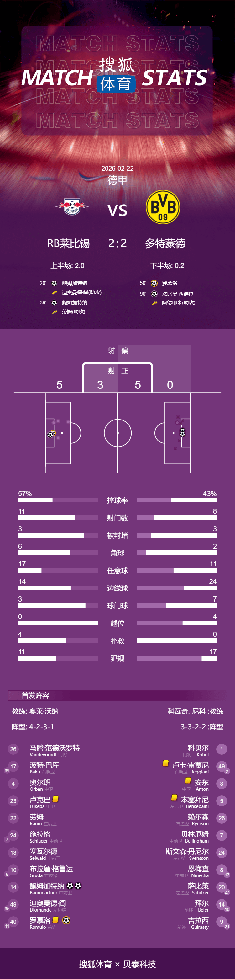 北京时间2月22日01:30,德国足球甲级联赛25/26赛季第23轮,排名第5的RB莱比锡坐镇红牛竞技场迎战积分榜第2的多特蒙德。上半场莱比锡由鲍姆加特纳梅开二度早早建立优势。下半场罗慕洛不慎自摆乌龙,多特在补时阶段由替补法比奥·西维拉绝平。最终RB莱比锡2-2多特蒙德,各取一分。