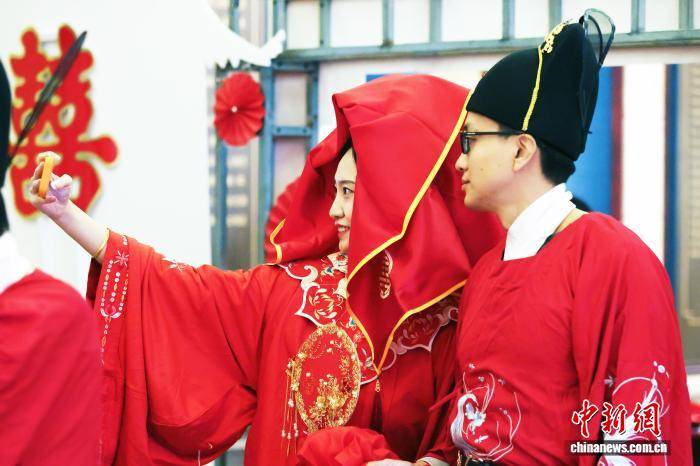 3月2日,上海市历史博物馆变身“浪漫殿堂”。9对新人在这里喜结良缘,参加“囍会历博·元来有你”集体颁婚书活动,完成了一场穿越时光的幸福仪式。图为:一对新人在仪式上用手机自拍。中新社记者 汤彦俊 摄