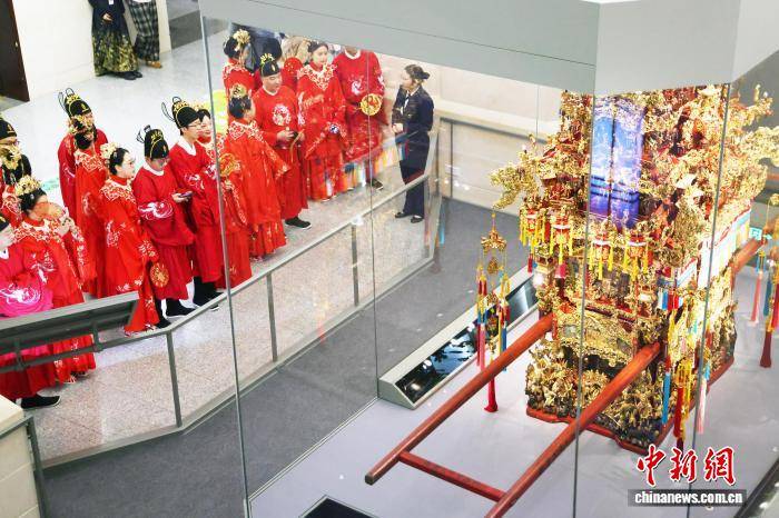 3月2日,上海市历史博物馆变身“浪漫殿堂”。9对新人在这里喜结良缘,参加“囍会历博·元来有你”集体颁婚书活动,完成了一场穿越时光的幸福仪式。图为:新人们参观馆藏重器“物华号百子大礼轿”。中新社记者 汤彦俊 摄