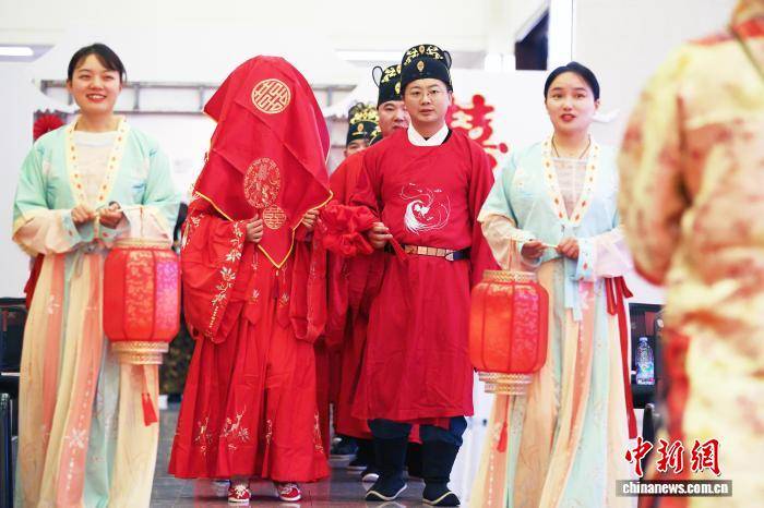 3月2日,上海市历史博物馆变身“浪漫殿堂”。9对新人在这里喜结良缘,参加“囍会历博·元来有你”集体颁婚书活动,完成了一场穿越时光的幸福仪式。图为:新人们结伴步入会场。中新社记者 汤彦俊 摄