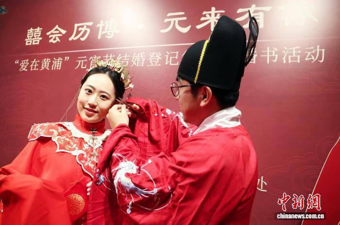 3月2日,上海市历史博物馆变身“浪漫殿堂”。9对新人在这里喜结良缘,参加“囍会历博·元来有你”集体颁婚书活动,完成了一场穿越时光的幸福仪式。图为:新人在仪式上“结发”,寓意:束发为盟,永不分离。中新社记者 汤彦俊 摄